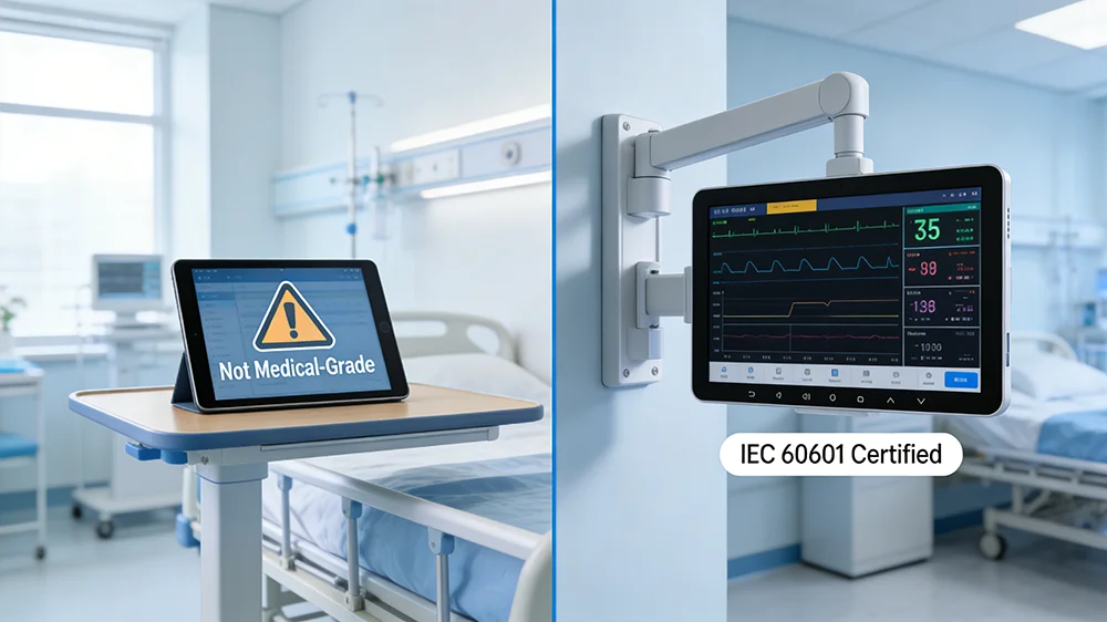 For hospital IT decision-makers, clinical engineering leaders, procurement specialists, and nursing administrators, understanding this distinction is essential. Deploying consumer tablets in clinical environments exposes organizations to regulatory risk, creates workflow friction, increases infection transmission vectors, and ultimately delivers a false economy.