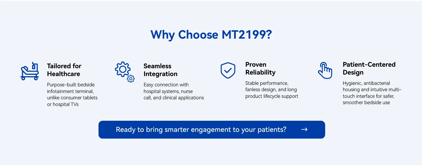 The MT2199 offers a high-performance platform for patient infotainment and seamless hospital system integration. Its advanced hardware ensures smooth operation of multimedia, clinical communication, and patient engagement applications, enhancing both patient experience and hospital efficiency.